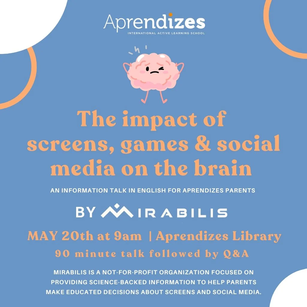Join us on May 20th at 9am in the Aprendizes Library for an informative talk by Mirabilis. Discover how screens, games, and social media affect children’s brains. Learn science-based insights to support healthier screen habits and informed decisions at home.