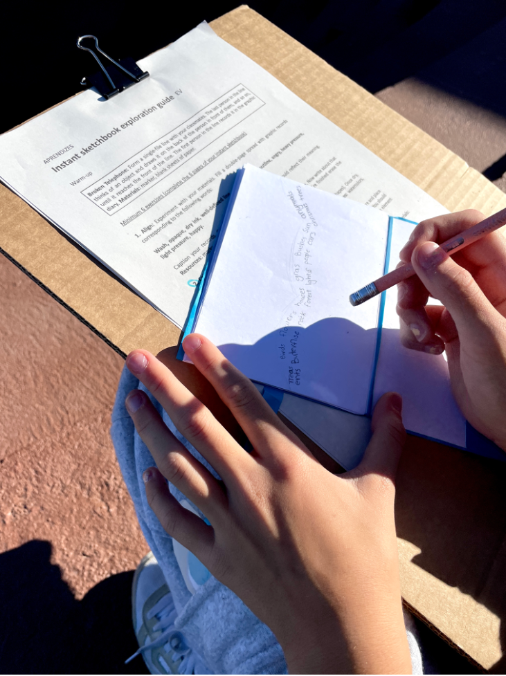 In the last class, they took their sketchbooks and materials outside and performed various exercises based on an interpretation guide. Some of the exercises included: Broken Telephone, Blobs and Odds and Who is Who?.