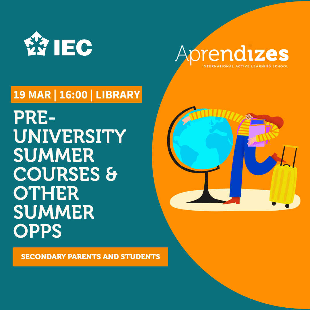 No dia 19 de março, às 16:00, na Biblioteca, terá lugar uma sessão de informação para alunos do ensino secundário e pais, em parceria com a IEC. Conheça cursos de verão para jovens dos 14 aos 17 anos e descubra várias formas que os alunos têm de enriquecerem o seu perfil para a universidade.